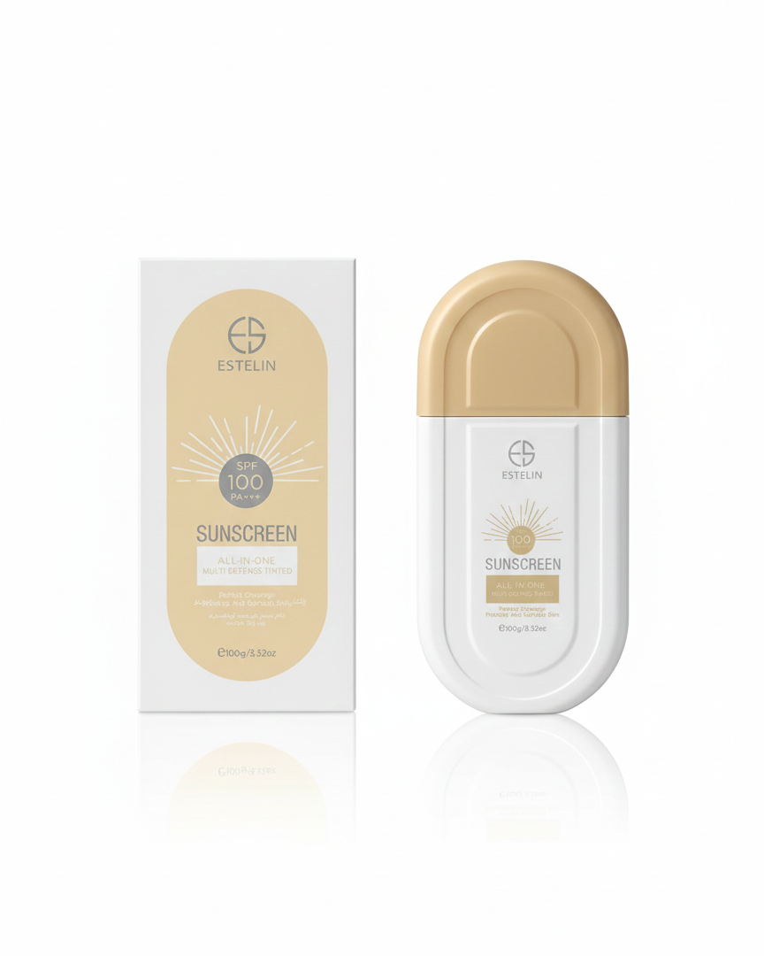 واقي الشمس الملون من ESTELIN يوفر حماية واسعة الطيف SPF 100 PA+++ ضد أشعة UVA/UVB والضوء الأزرق (HEVIS) مع تغطية خفيفة طبيعية توحِّد لون البشرة وتخفي العيوب الطفيفة بدون ملمس دهني.